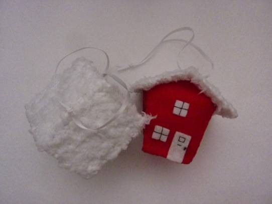 Cut out pieces of felt in any colour you like. The door is a piece of white felt 2cm by 1cm, the windows are pieces of white felt 1cm square.