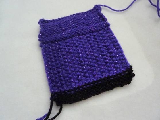 - Sew the inner panels to the inside of the outer panels wrong sides together using purple yarn so that you stitches will not show on the outside of the pouch – make sure that you only sew the bottom and sides so that you create a pocket for you items