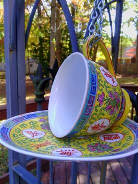 If you just have a tea cup without its saucer – it might even be chipped, you can fill it with melted fat and seeds so that the birds’ food is solid inside.